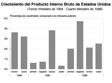 La predicción unánime de la firma privada de análisis económico Blue Chip Economic Indicators es que la economía estadounidense se expandió el 2,5 por ciento sobre una base anual durante el cuarto trimestre de 1996. Esa estimación se funda en una encuesta de más de 50 pronosticadores económicos independientes empleados en los principales bancos, compañías de seguros, empresas manufactureras, casas de corretaje y universidades. El crecimiento calculado por Blue Chip para todo el año 1996 es del 2,3 por ciento, ligeramente superior a la tasa de crecimiento del 2 por ciento registrada en 1995.