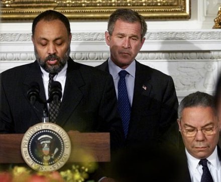 | President Bush, center, listens to Imam Abdullah Muhammad Al-Khouj, left, deliver a prayer before the start of Iftaar dinner at the State Dining room of the White House on Monday, Nov. 19, 2001, in Washington. Also sitting at the table is Secretary of State Colin Powell, right. (AP/WWP Pablo Martinez Monsivais) | |||||||||