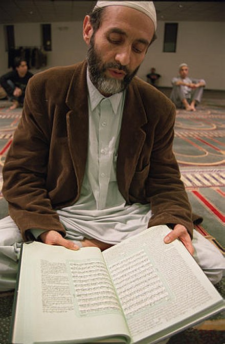 | Ismail Syed reads from the Quran at the Masjid Hazrat-I-Abubakr, New York City's largest Afghani mosque, on the first night of Ramadan, Friday, Nov. 17, 2001. (AP/WWP Tina Fineberg) | |||||||||